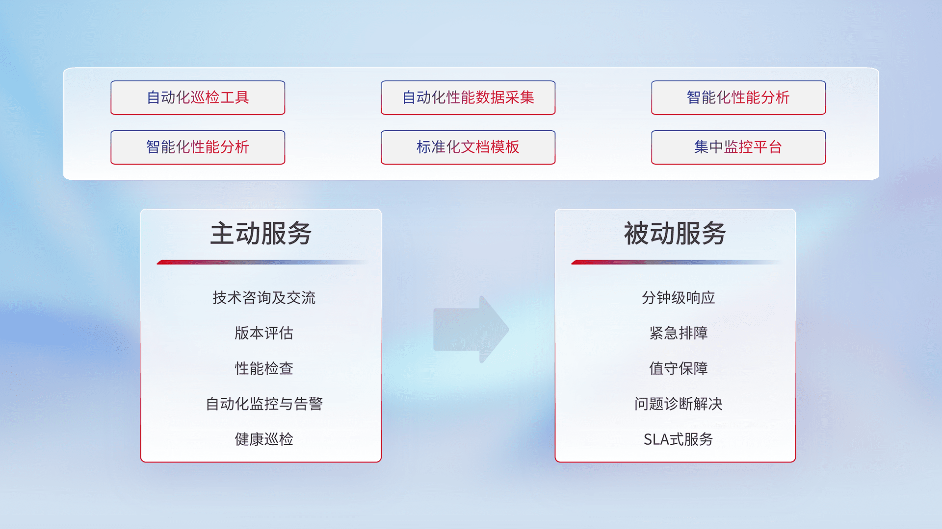 智能化工具和标准化文档,,,保障服务质量,,,,提供主动服务(包含技术咨询、、、版本评估、、、性能检查、、自动化监控与告警、、、健康巡检)和被动服务包含(分钟级响应、、紧急排障、、值守保障、、问题诊断解决、、、SLA服务)。。。。